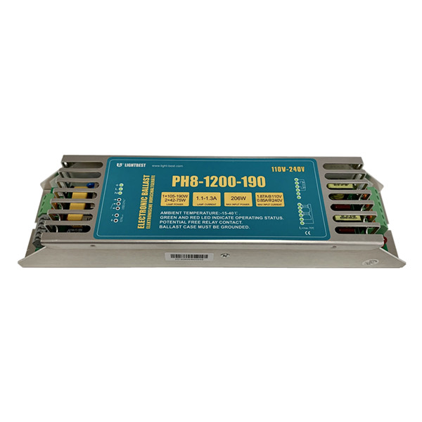 | PH8-1200-190 | 1.87 أمبير عند 110 فولت 0.85 أمبير عند 240 فولت | 206 | 250*65*40 | 1.0-1.2 | 42-190 | 1 * مصباح: GPHA1000T5 GPHA1554T5 2 * مصباح: GPHA843T5 GPHA357T5 |